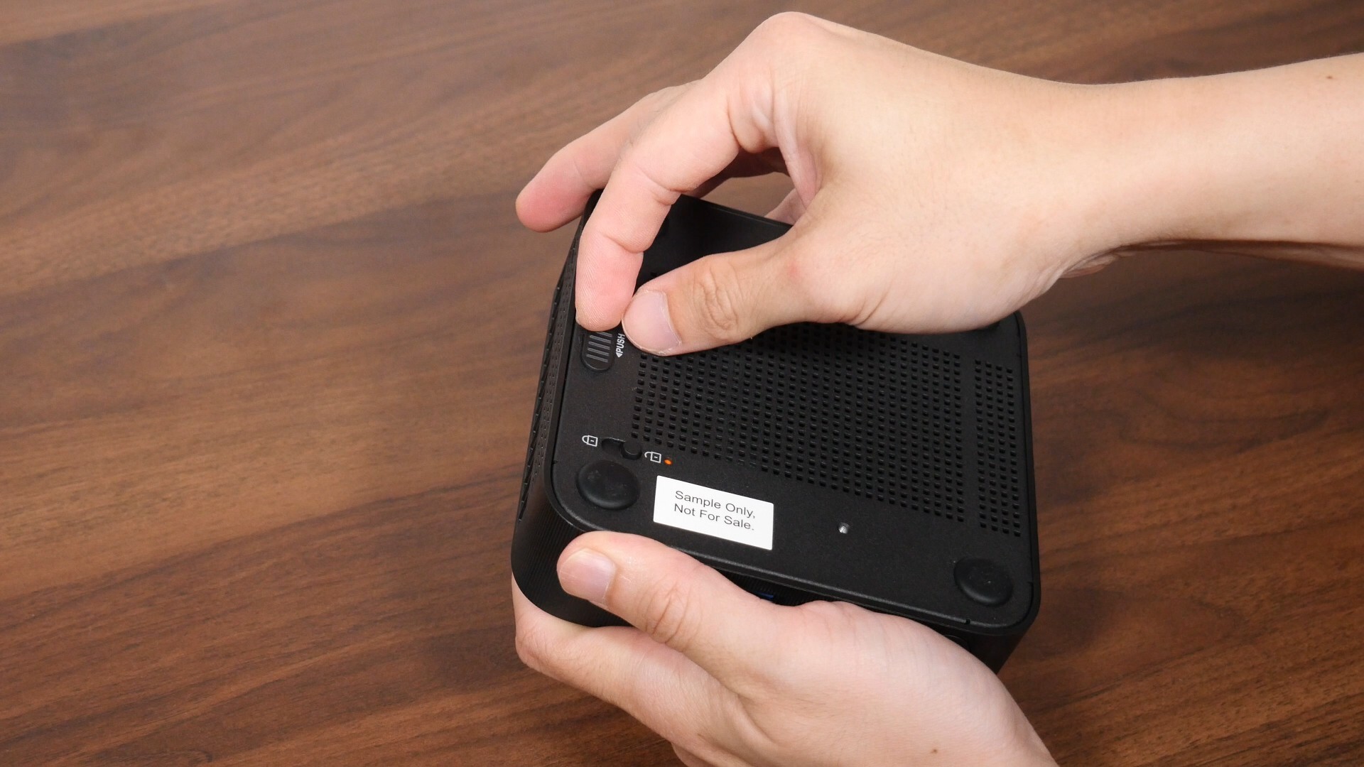 The mini PC has an exterior chassis that’s constructed entirely of plastic, with a matte finish for the top and bottom. As can be seen, we get a fingerprint sensor on the top panel, and over on the bottom panel, we get no shortage of little square ventilation openings and four round rubber feet. Also visible are the two screw holes that are to be used for VESA mounting purposes, and a latch and lock mechanism that are used for service access purposes.