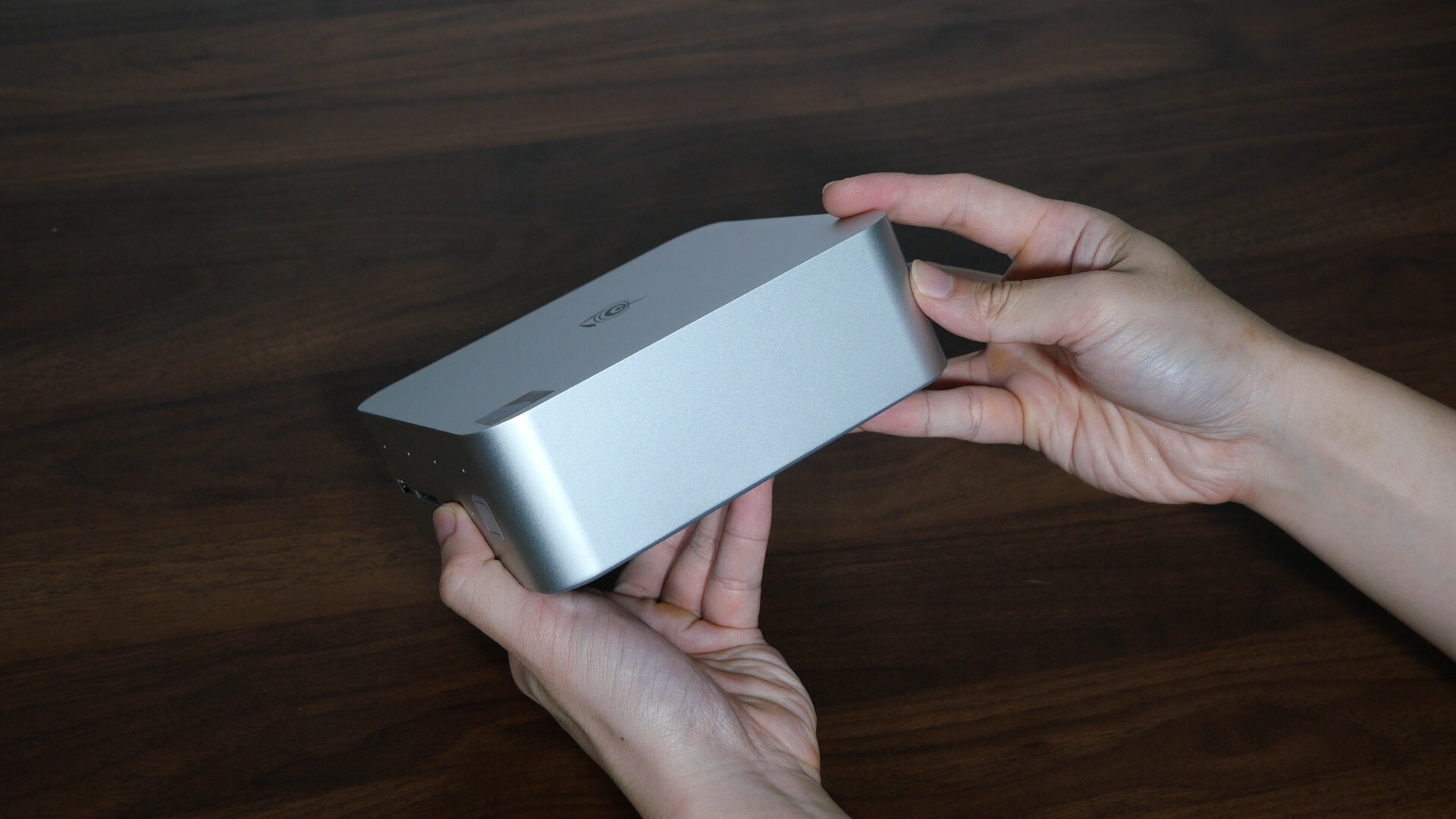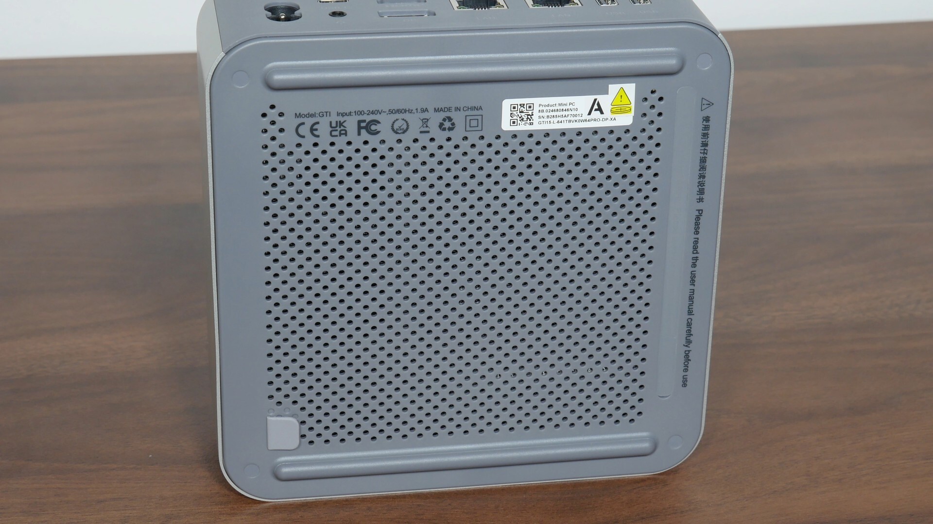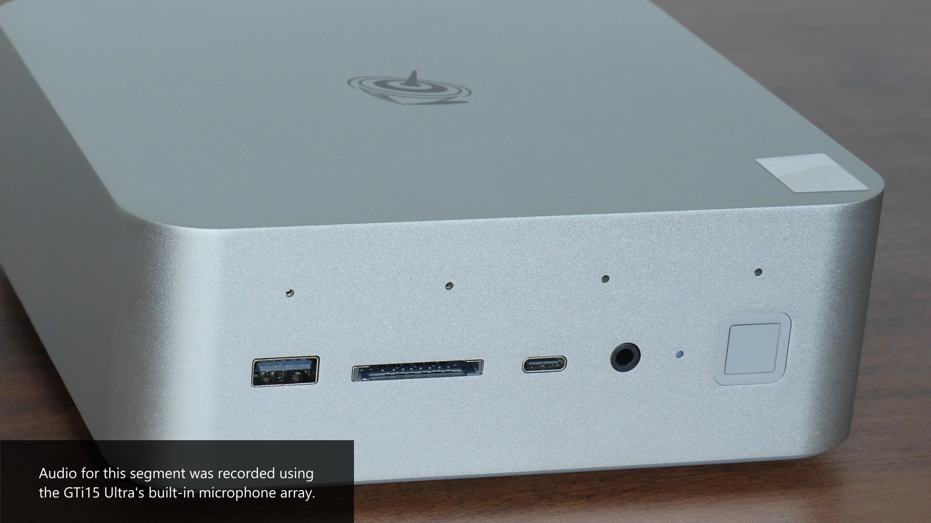 The GTi15 Ultra has a very clean aesthetic thanks to its predominantly metal construction, where we do get some plastic bits on the rear and for the bottom lid. The front and rear panel’s pretty straightforward; we get your usual array of connectivity options, and the front panel also has four small round holes that are openings for the GTi15 Ultra’s built-in microphone array. The mini PC can be considered a smidge larger than typical mini PCs, where it measures in at approximately 158mm x 158mm x 60mm (including the PC's feet).