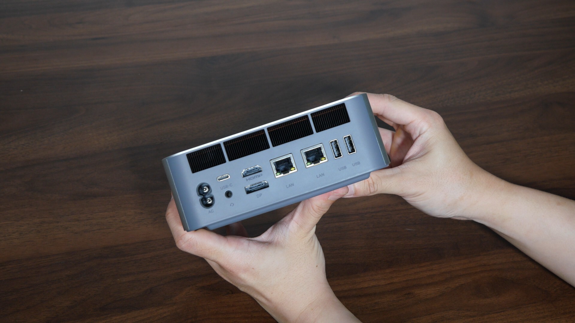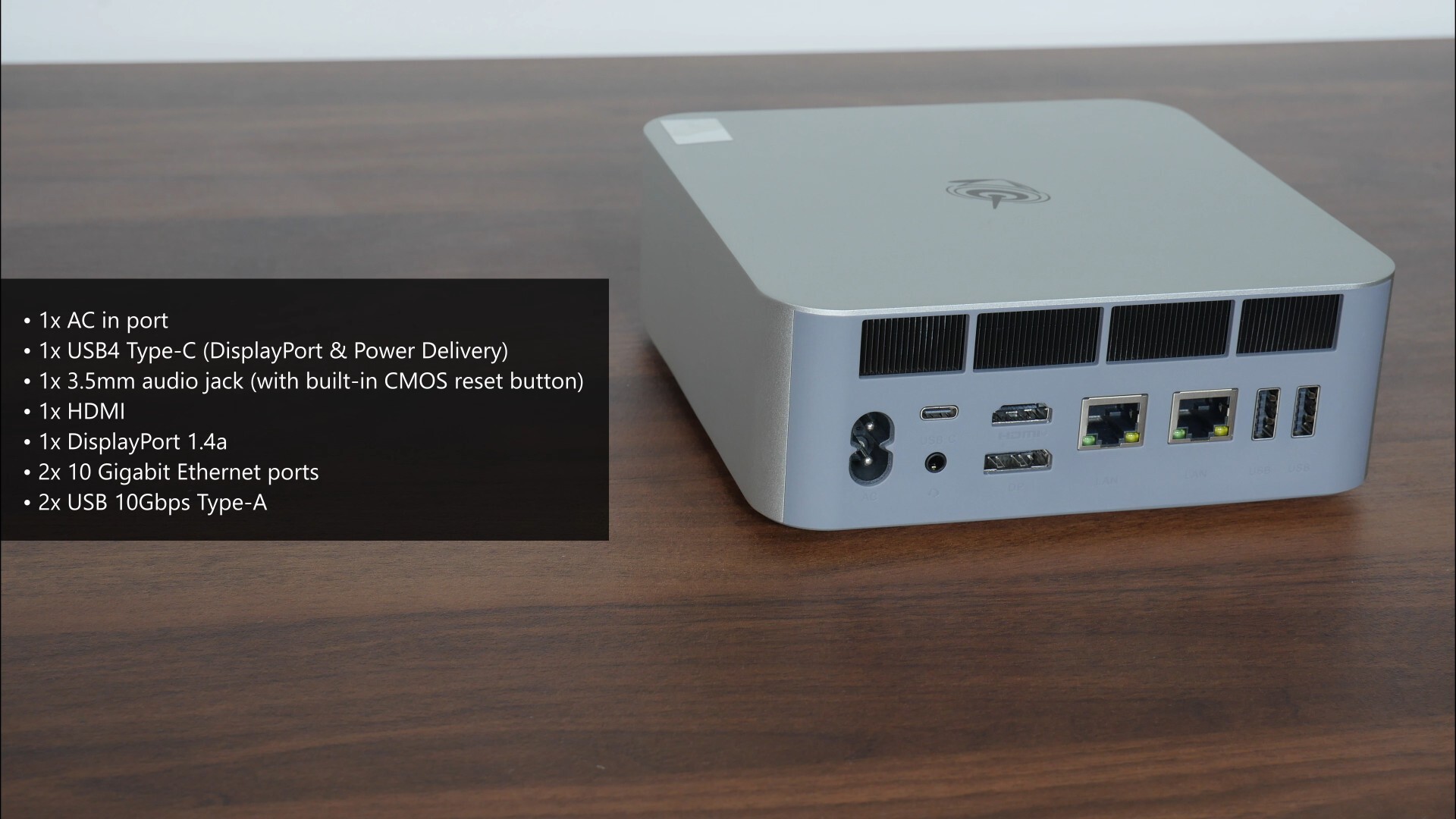 Over on the rear, we get an AC in port for the mini PC's power cord, a USB4 Type-C port that supports DisplayPort video output and Power Delivery for device charging purposes, as well as a 3.5mm audio jack that comes with a built-in CMOS reset button within the jack itself - you'd have to use a thin object (e.g. a pin) of length no less than 2.5cm to depress the clear CMOS button inside the jack. Moving on, we get a HDMI port, a DisplayPort 1.4a port, dual 10 Gigabit Ethernet ports as well as two USB 10Gbps Type-A ports.