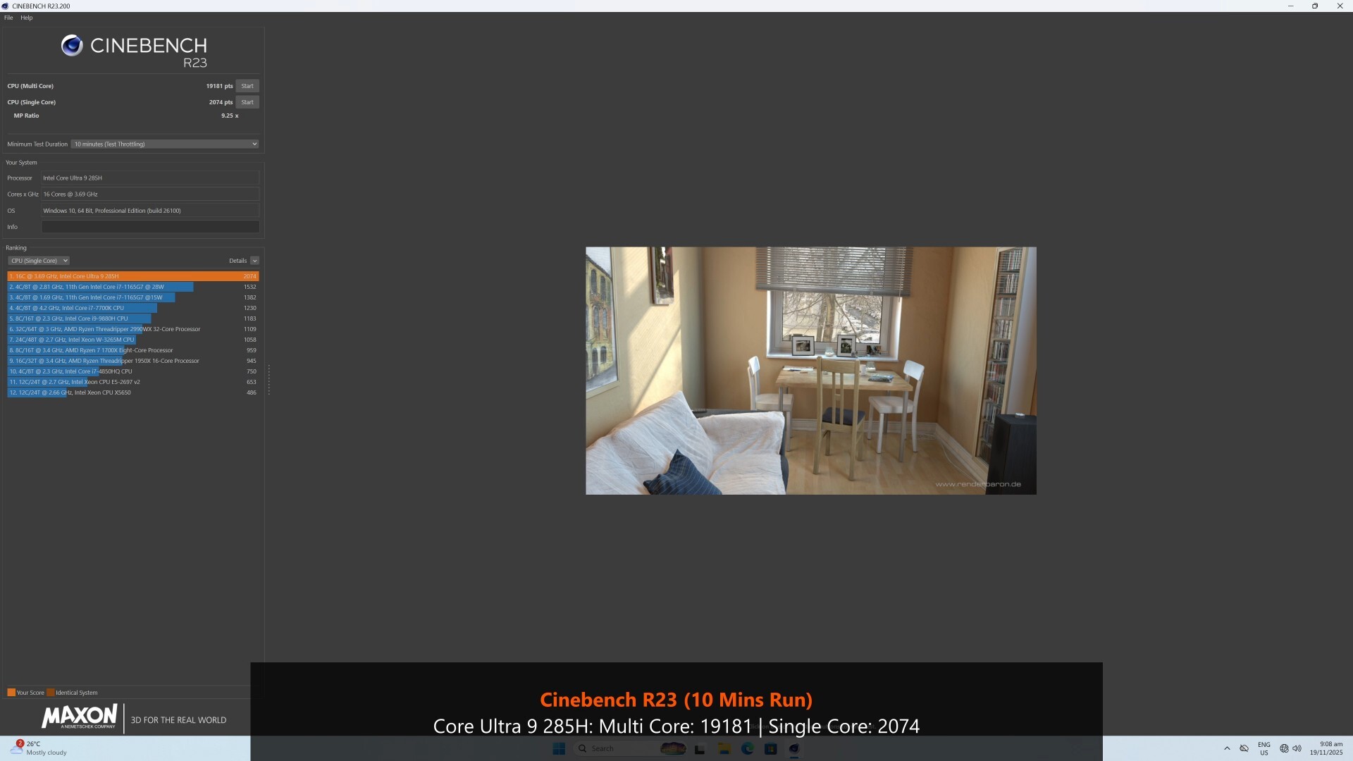 Next up is CInebench 2024, where the Core Ultra 9 285H achieves a multi core score of 1093 and a single core score of 129.