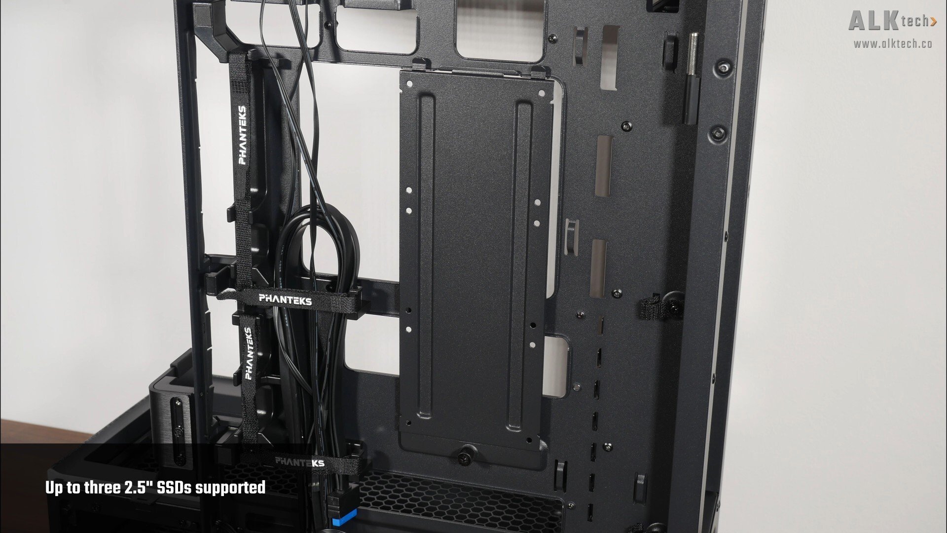 For you folks intending to install 2.5” and 3.5” drives for your PC build, the Evolv X2 Matrix comes with a removable bracket on the back of the motherboard tray that’s held in place by a thumbscrew. This bracket comes with support for up to three 2.5” SSDs.