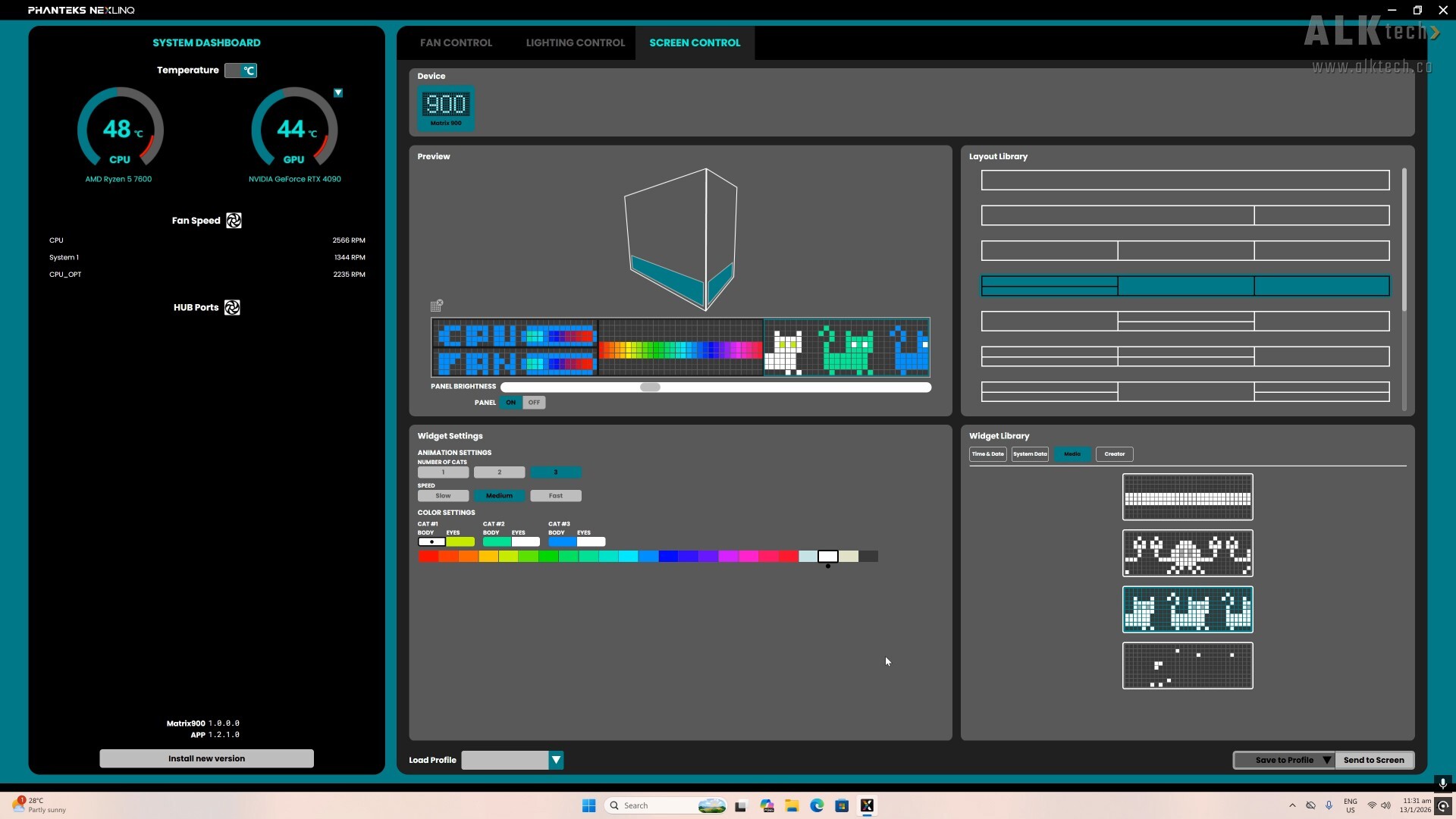 Let's spend some time to talk about the software control for the matrix LED feature. To customise what appears on the LED panel, you'll need to download and install the Phanteks NexLinq app, and under the "Screen Control" tab, we get a "Preview" card that mocks up how the display will look like with your customisations, and a "Layout Library" consisting of 12 preset layouts. The matrix LED panel is divided into three distinct sections for widgets, and within each section, you can further divide it into two layers, such that you can have up to six widgets in total across the whole panel.