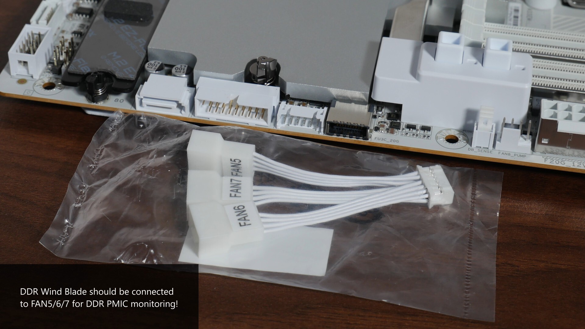 The remaining three headers require the use of the included fan power extension cable, which converts a 12-pin header (pictured above) into three four-pin PWM fan connectors. These three headers support DDR PMIC reading, where any one of them should be used with the included DDR Wind Blade attachment.