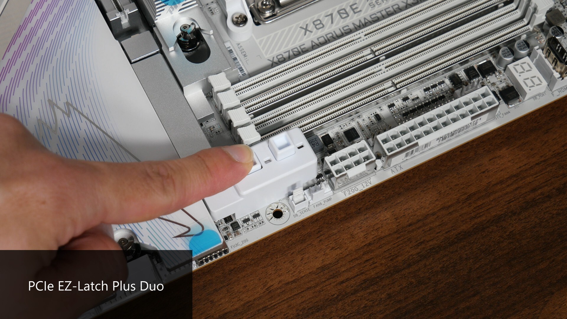 Also, the Gen5 slots both come with the PCIe EZ Latch Plus Duo feature that helps make removing PCIe cards from the slots less of a painful affair – we even get rectangular windows next to the latch release buttons that indicate whether they're locked in place or not for the respective slots.