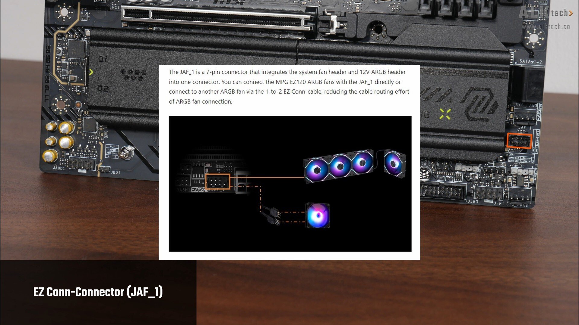 Visuals on the above accessories can be found in the walkthrough video for this motherboard, which is embedded at the top of this article. That said, the 1-to-2 EZ-Conn-cable forms part of a MSI specific-feature called EZ Conn, which allows end-users to connect an addressable RGB device and a fan to a single proprietary EZ Conn header on the motherboard - MSI's intention here is to simplify the hardware setup process, and I'll give a lowdown on EZ Conn later in this article.